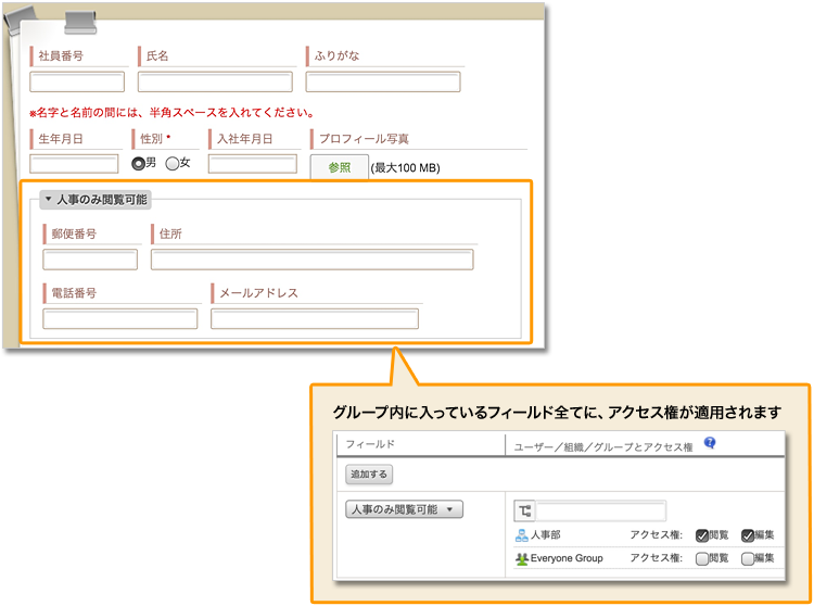 グループフィールドの中に入っているフィールドに、まとめてアクセス権を設定できます。ひとつずつアクセス権を設定する手間が省けます。