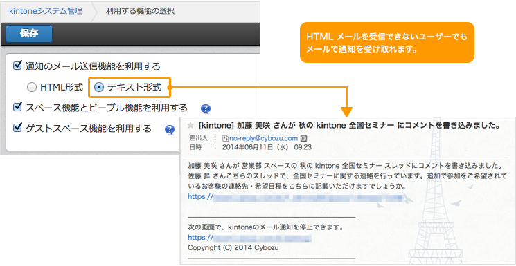 通知メールの形式を HTML 形式/テキスト形式から選択できる