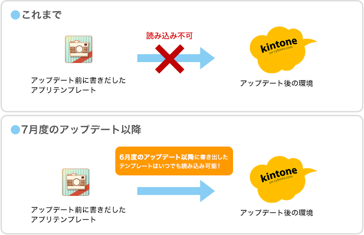 これまでは「kintone」のアップデートにより、それ以前に書き出したテンプレートを読み込めなくなることがありました。今回のアップデートにより、2014年6月度のアップデート以降に書き出したテンプレートは、今後いつでも読み込めるようになります。