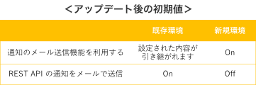 ※ 「通知のメール送信機能を利用する」の初期値については9月版のアップデート以降、新規に試用を開始した環境が対象となります。新規環境と既存環境の初期値は下記をご覧ください。