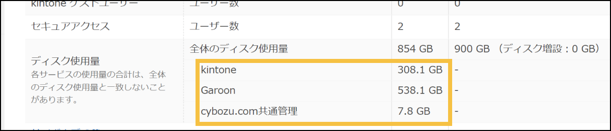 - cybozu.com共通管理(監査ログなど、各サービス共通のディスク使用量が表示されます。)