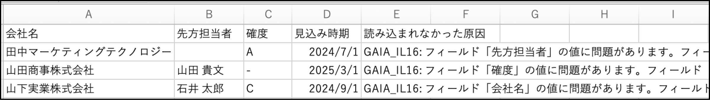 読み込みに失敗した行がある場合、CSVのダウンロードリンクが表示されます。CSVには、読み込んだファイルの全行のうち読み込まれなかった行が、発生したエラー内容と共に記載されるため、このCSVファイルをもとに修正し、そのまま再読み込みすることが可能です。