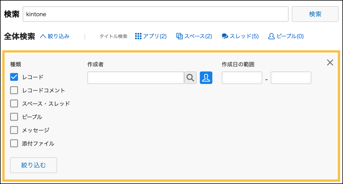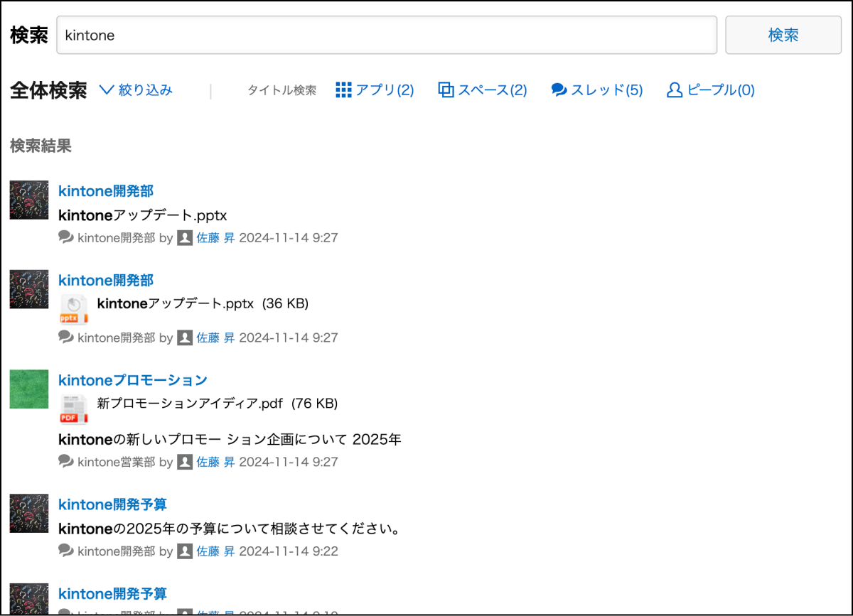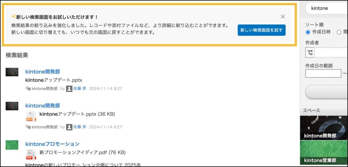 検索結果をアプリやスペース、添付ファイル等の種類ごとに絞り込めるようになる、新しい検索画面の提供を開始します。絞り込み機能の強化のほか、アプリ名やスペース名等がヒットした場合に補足情報が表示されるようになるなど、検索性の向上を図っています。