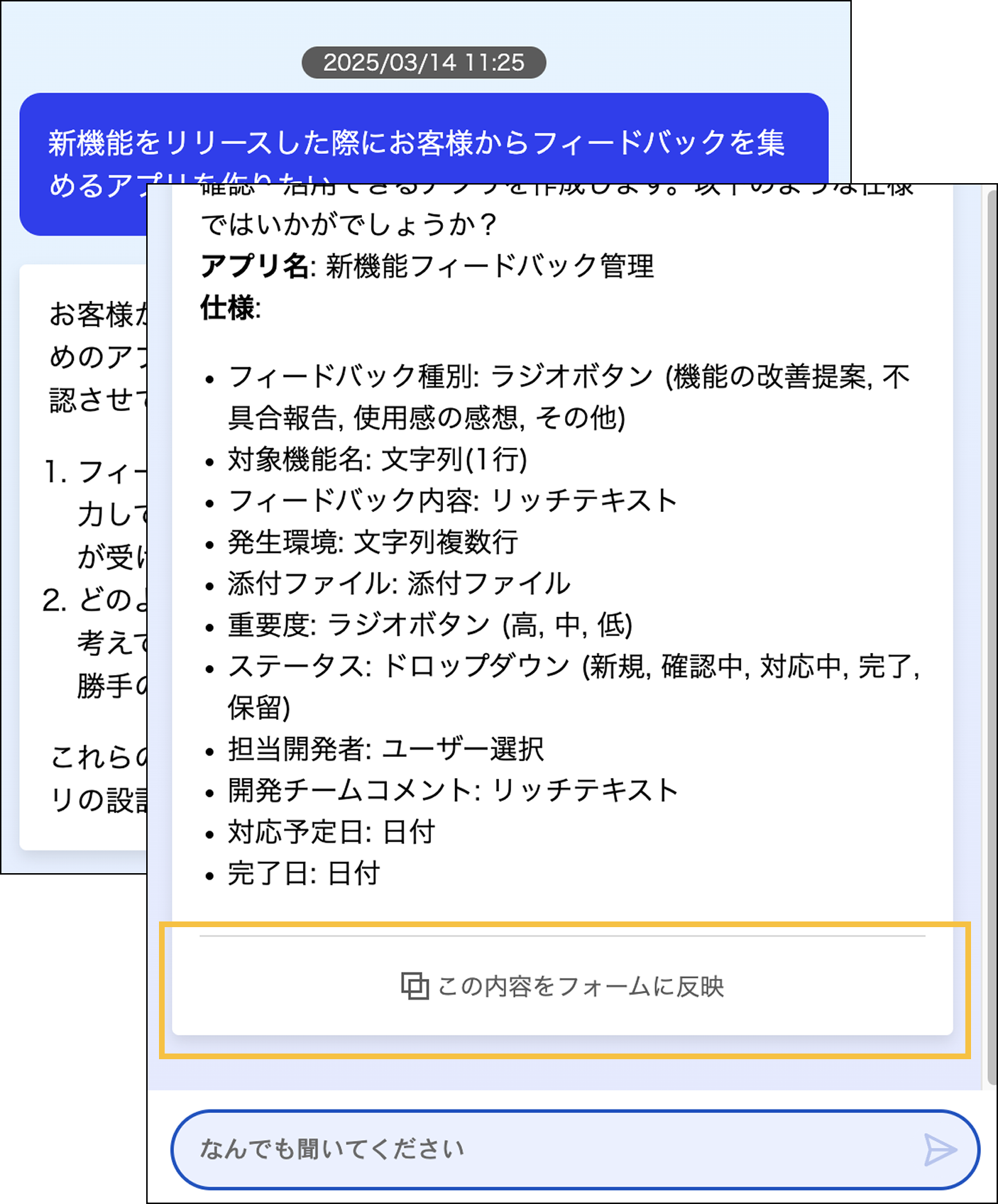 アプリ作成AI:AIと対話しながらフォーム作成を進められる機能