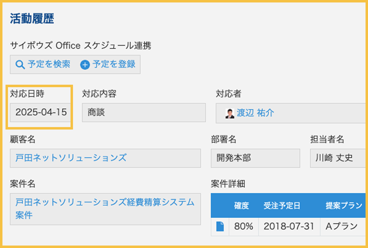 「サイボウズ Office スケジュール連携」プラグインがアップデートされました。レコード詳細画面からサイボウズ Officeの予定を登録する際、プラグインの設定画面で指定した日時または日付フィールドの値を予定の開始日の初期値として設定できるようになりました。商談日やタスクの締切日などのフィールドを指定することで、予定の開始日を入力する手間を削減できます。この機能はバージョン1.0.4からお使いいただけます。
