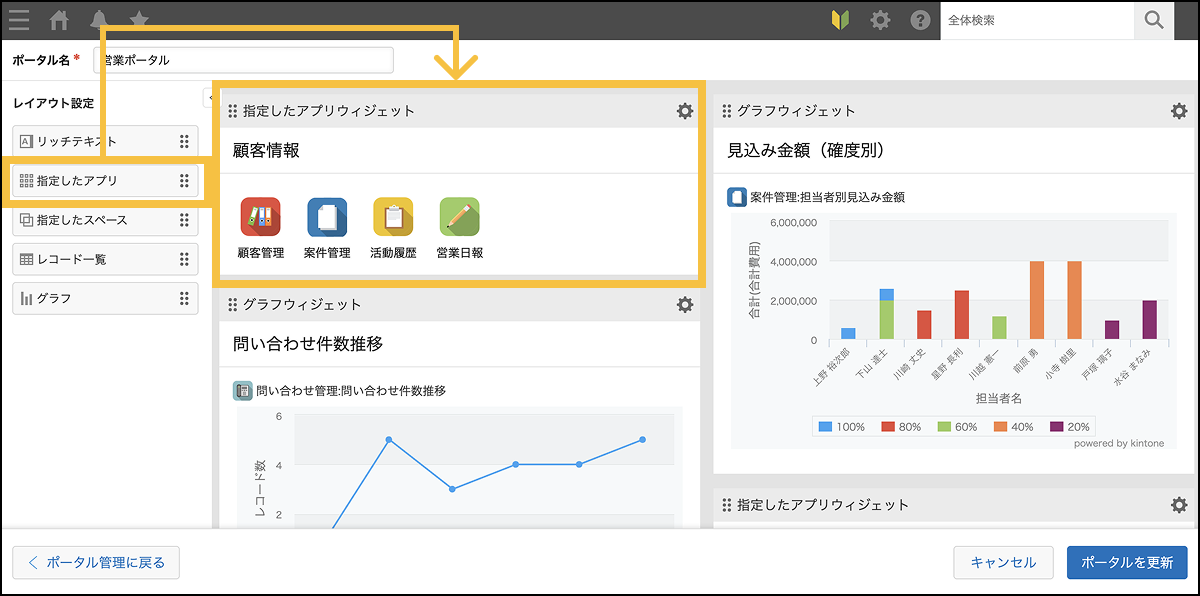 例えば、営業部のメンバーがログイン直後にkintoneを開いた際に、「営業ポータル」が最初に表示されるように設定できます。