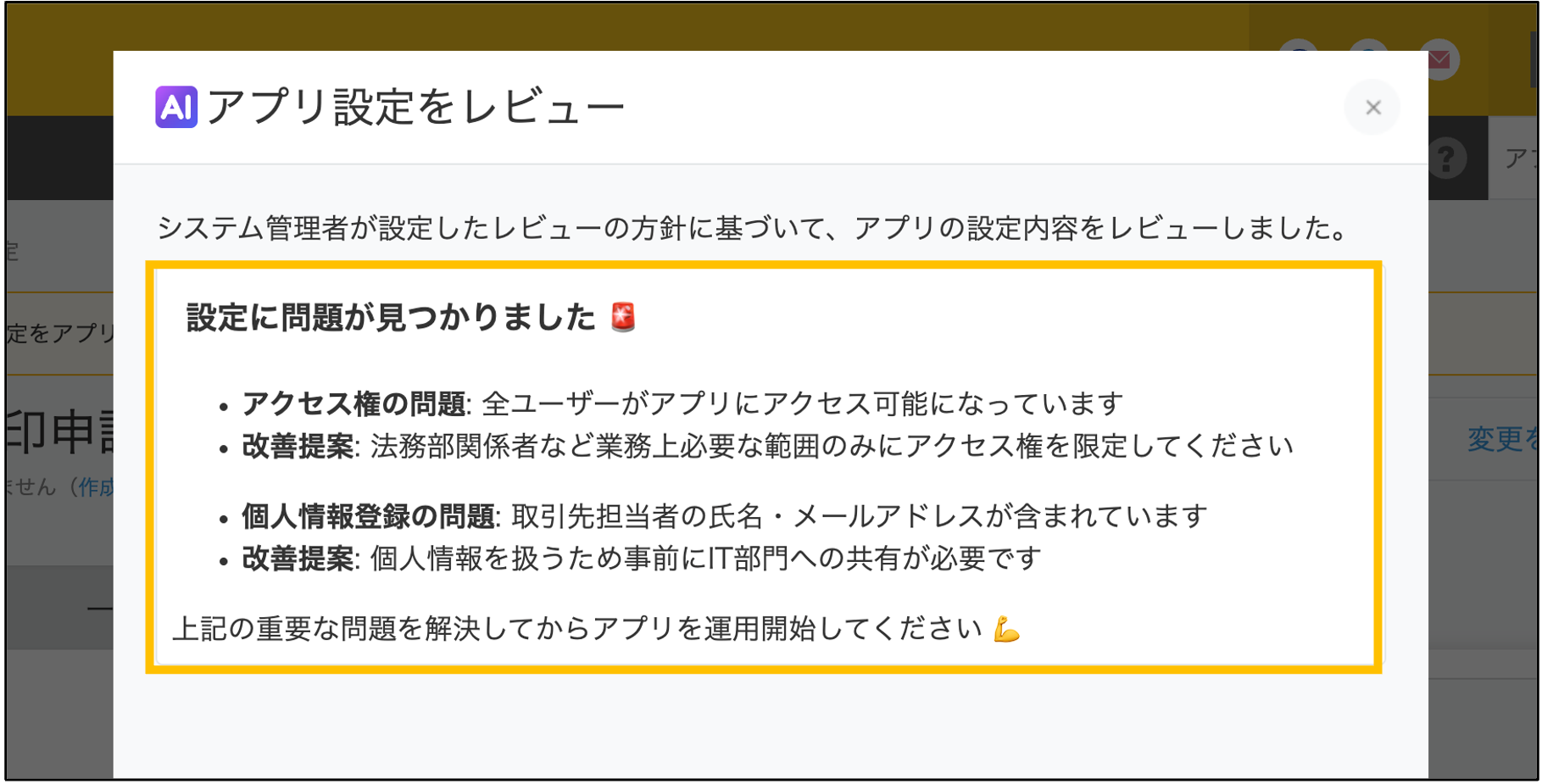 機能が有効なとき、アプリ設定画面上に「アプリ設定をレビュー」ボタンが表示され、クリックするとAIによるレビューが実施されます。