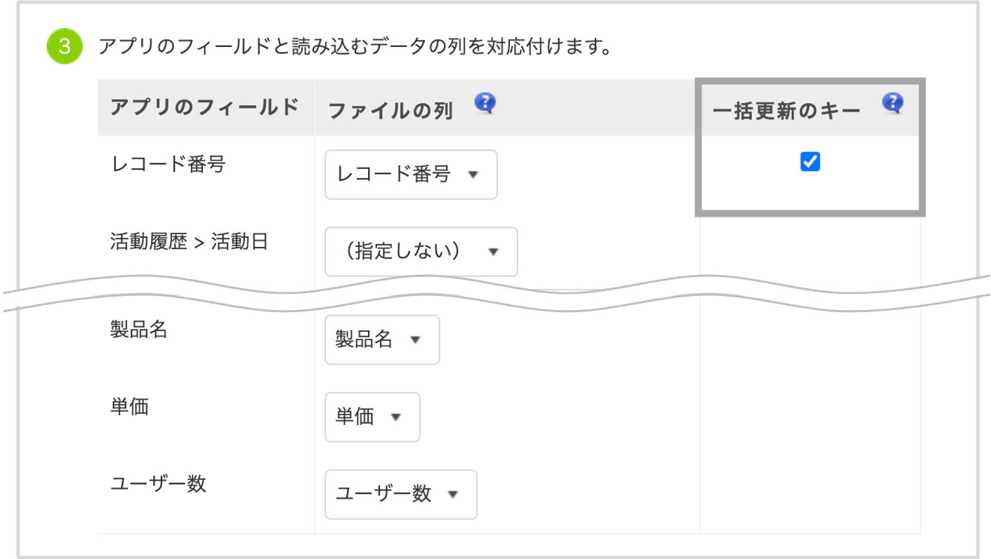 「レコードの更新と追加」を選択した場合にのみ、更新キーとするアプリのフィールドと対応するファイル内の列を指定する設定項目が追加で表示されます。