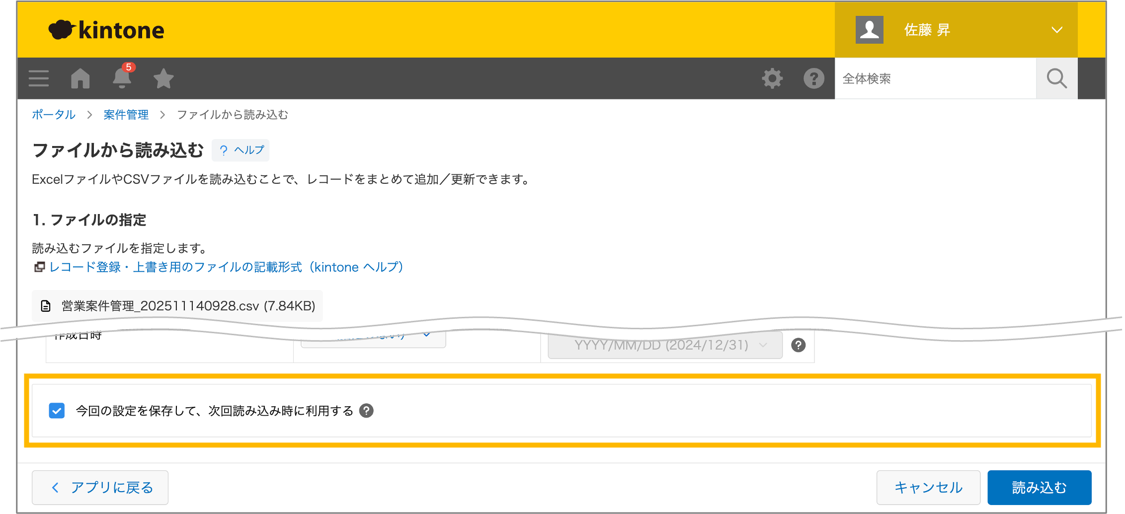 読み込み設定を保存する設定を有効にした上でファイル読み込みを行うことで、次回以降、列の並び順や項目名が同一構成のファイルを選択した際に、保存された読み込み設定が自動的に適用された状態から設定作業を行えるようになります。