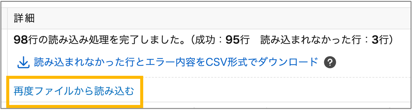 ファイル読み込み機能において、読み込み処理が完了後に読み込まれなかった行が存在する場合、「読み込まれたファイル」画面に、再度ファイルから読み込むボタンが表示されるようになりました。
