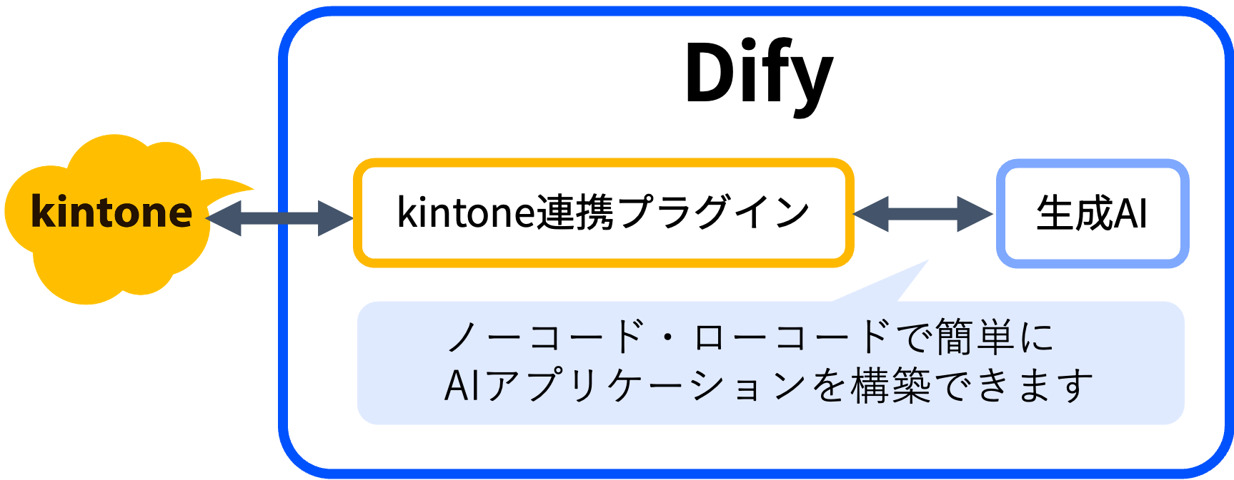 ノーコード・ローコードAIアプリ開発プラットフォーム「Dify」のマーケットプレイスに、kintone連携プラグインを公開しました。これにより、Difyからkintone上に蓄積されたデータを参照して、LLM*を活用したAIアプリケーションをノーコード・ローコードで作成し、生成AIを利用した業務改善をより簡単に行えるようになります。