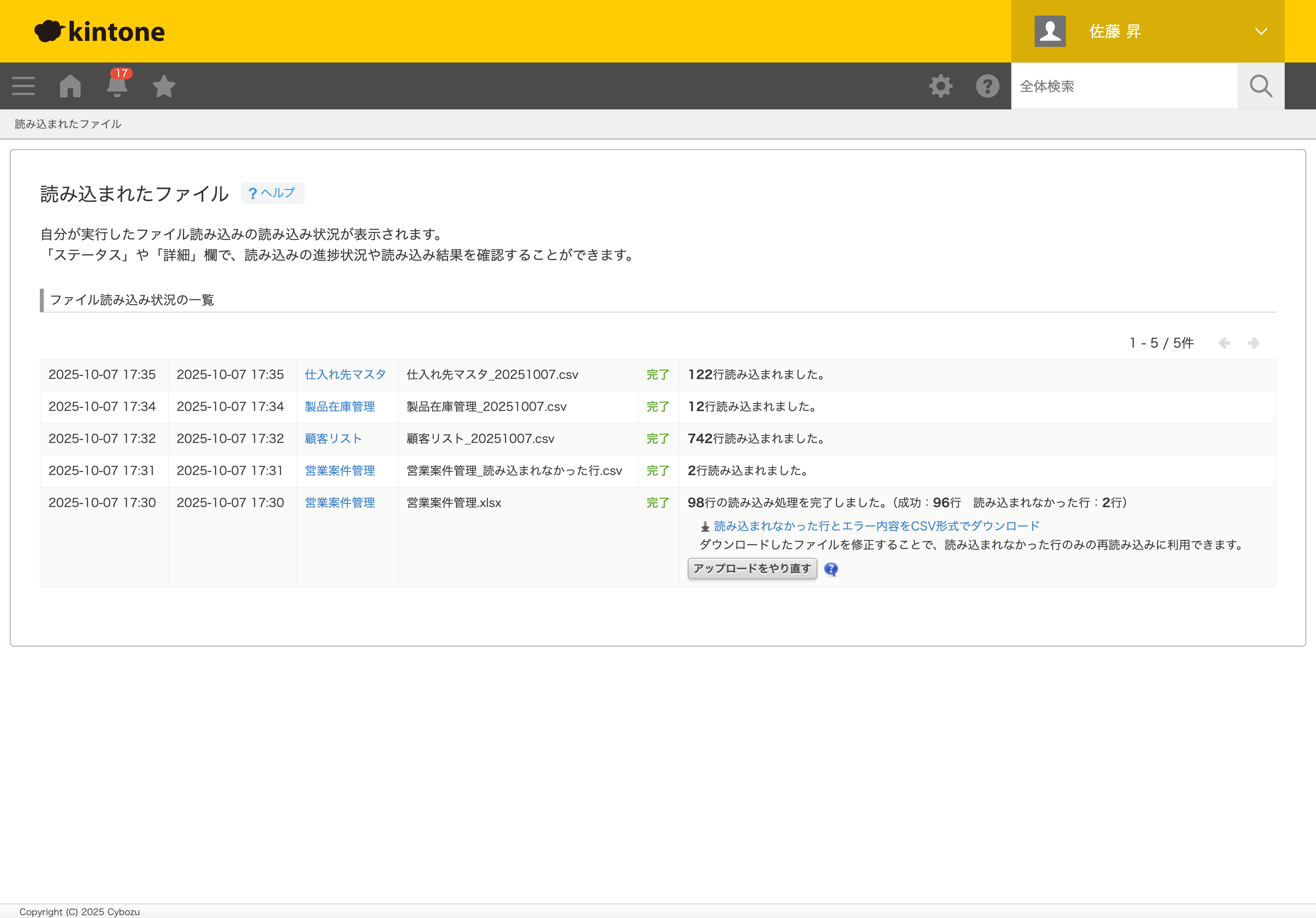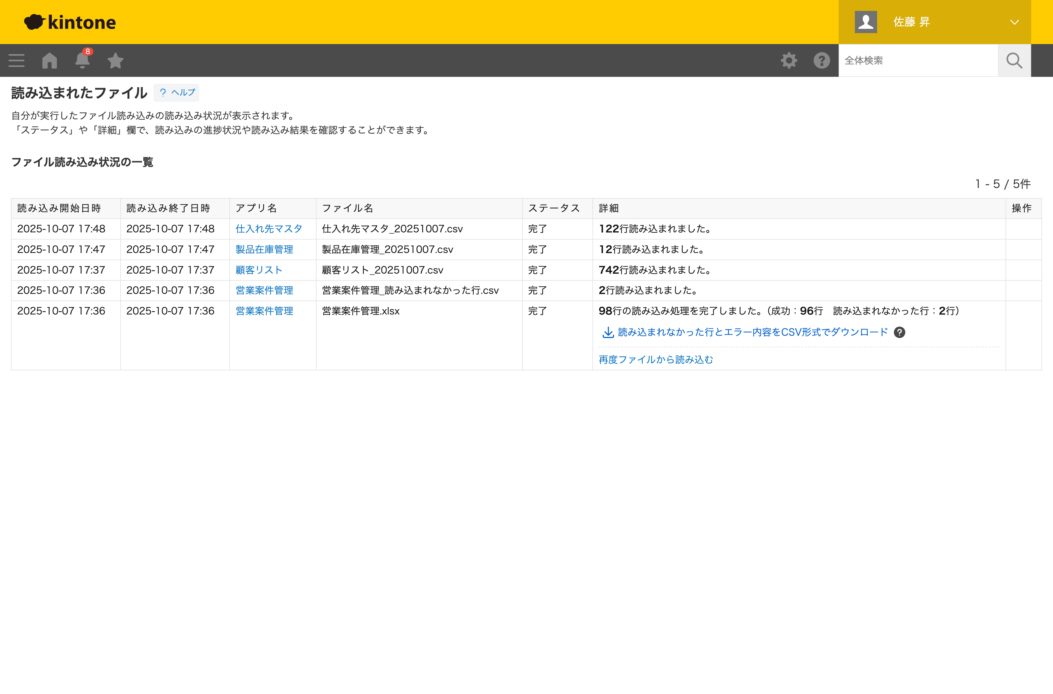 kintone開発チームでは、今後の製品改善スピードの向上を目指し、リリース当初から利用し続けてきたフロントエンドの技術基盤の刷新を、各種画面で順次進めています。今回、新たに「読み込まれたファイル」画面のフロントエンド基盤が刷新され、それにあわせてレイアウト・パーツも一部変更されています。